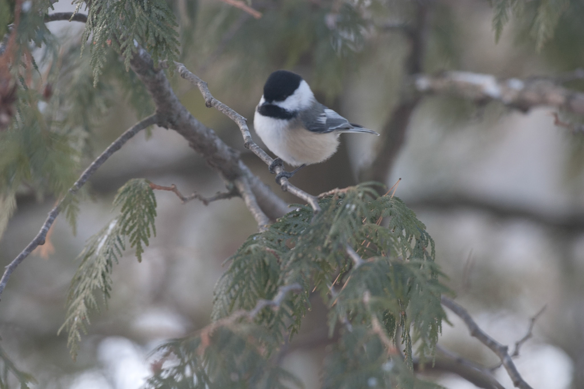 Description - This small bird can be identified by its black cap and bib and white cheeks. The back is grey with white underparts; the wings are edged with white. Their characteristic call is a buzzy "chick-a-dee-dee-dee".