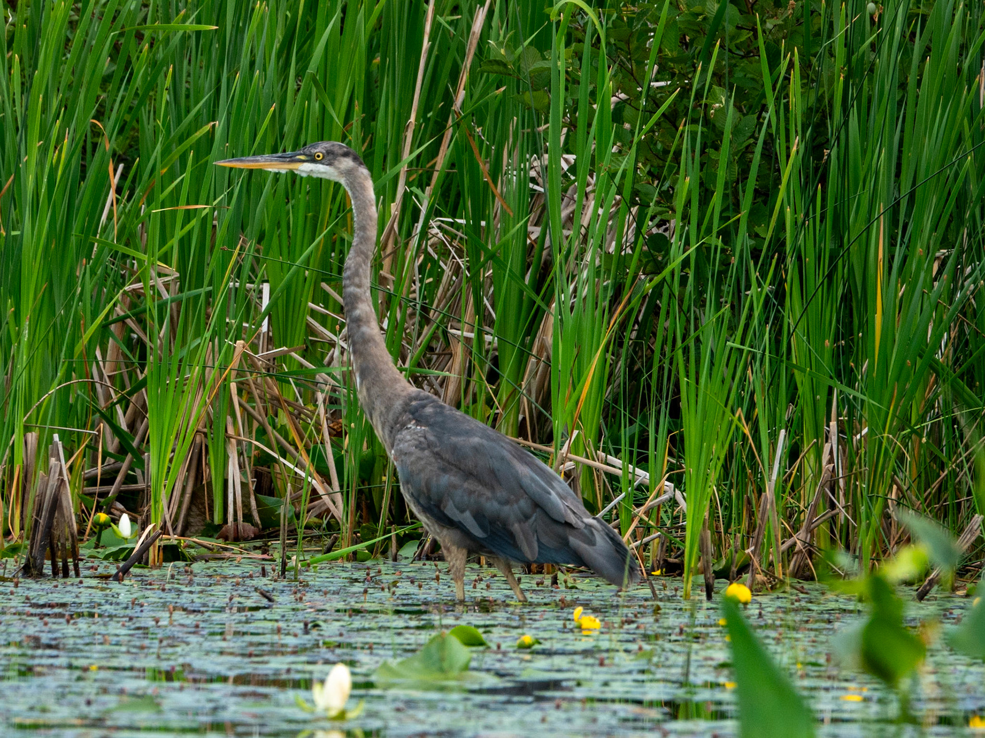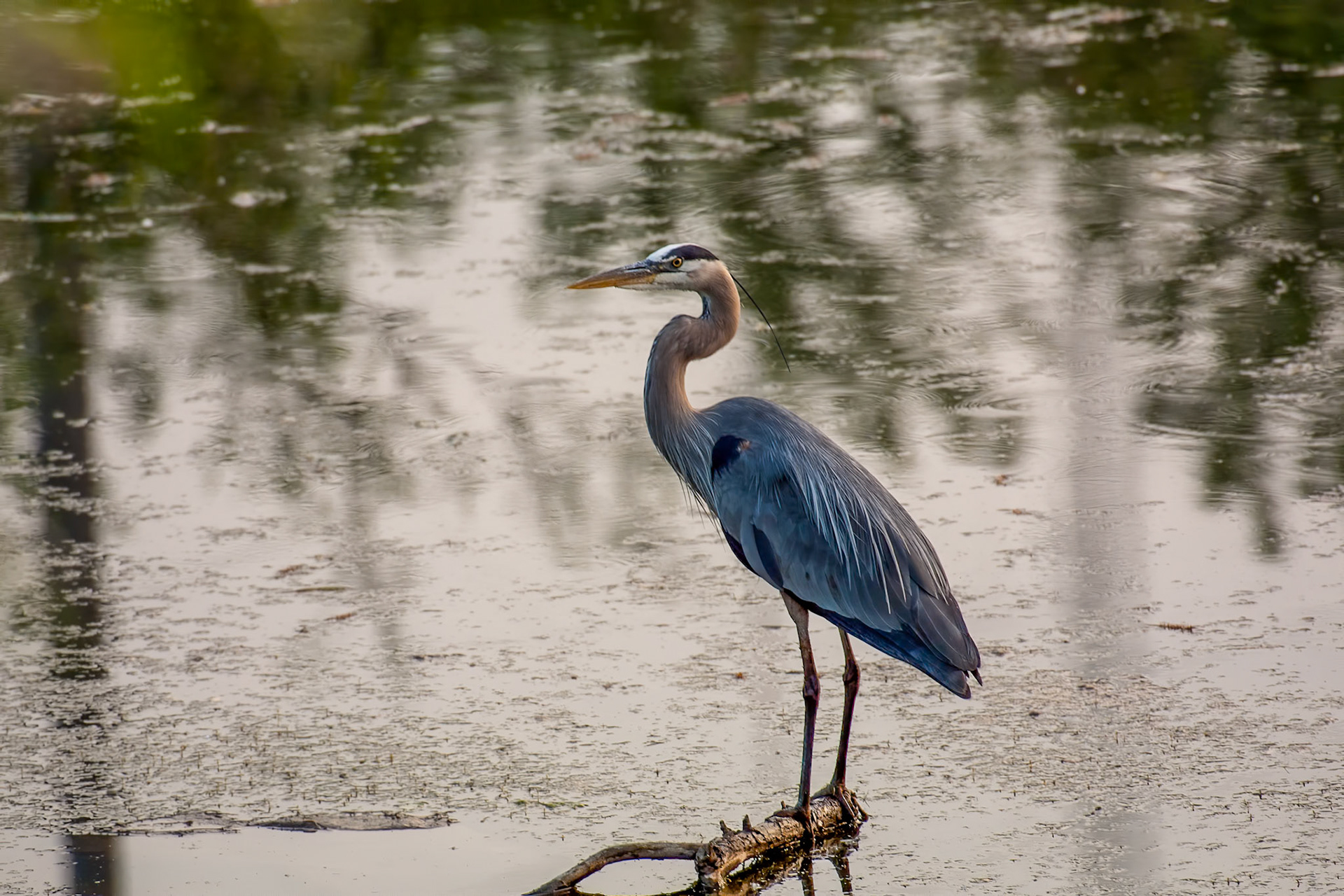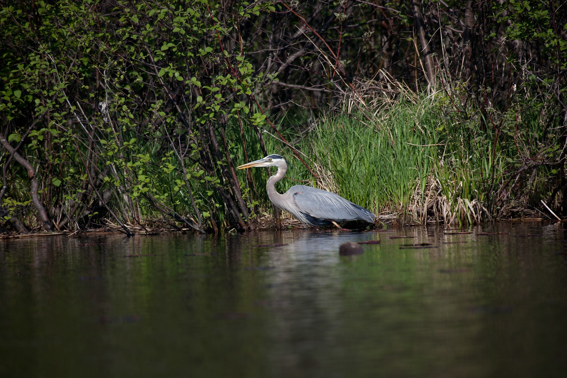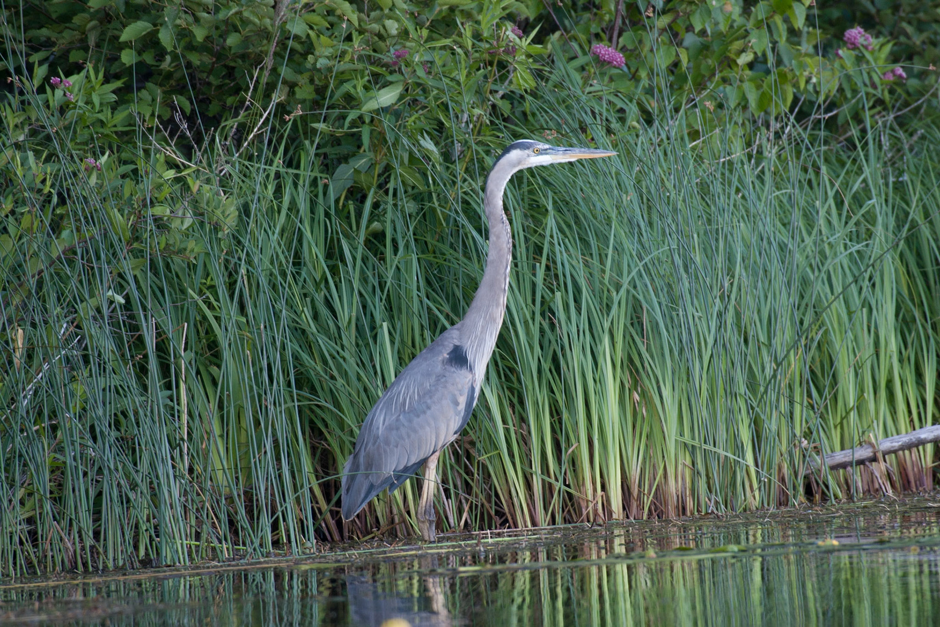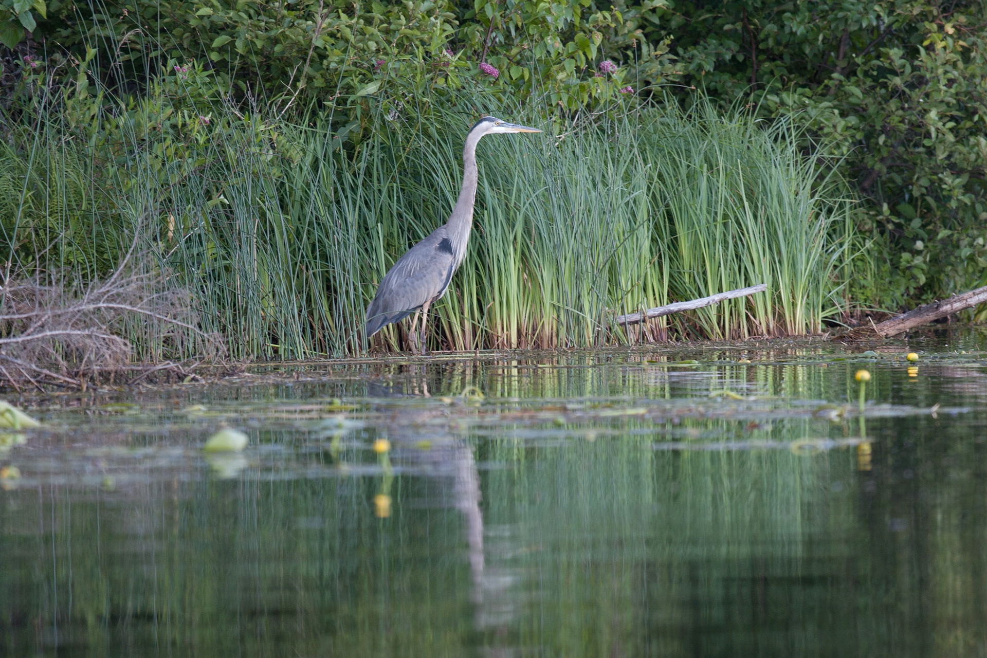 A Great Blue Heron watches for an early morning snack in the waters of Lake Superior near Superior Entry.