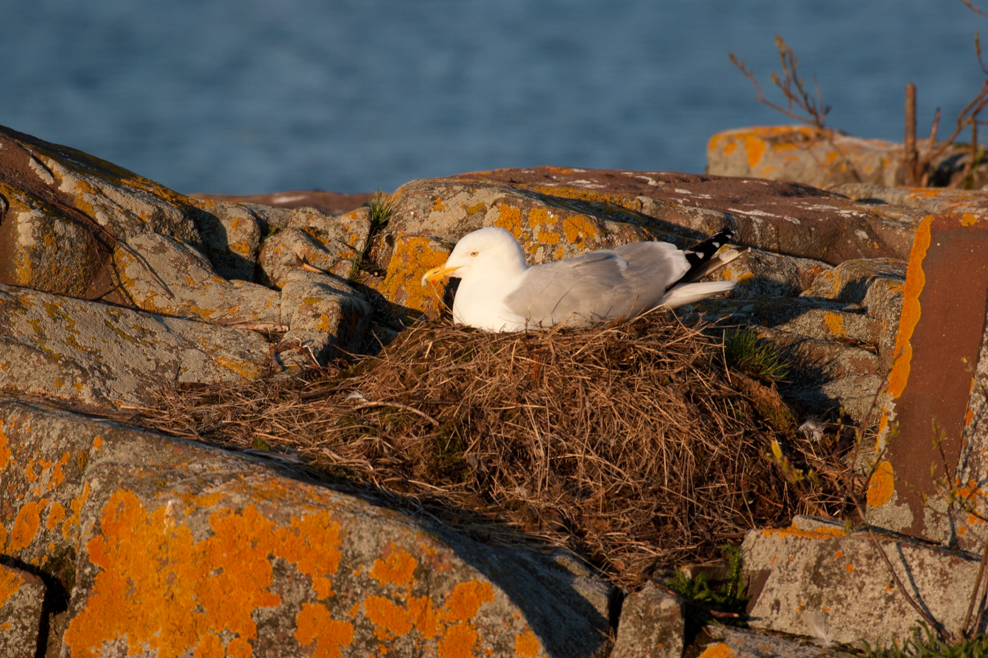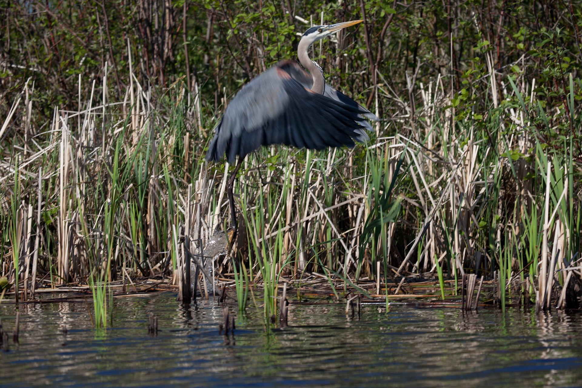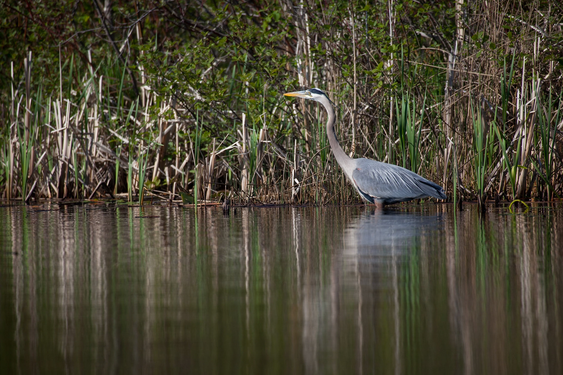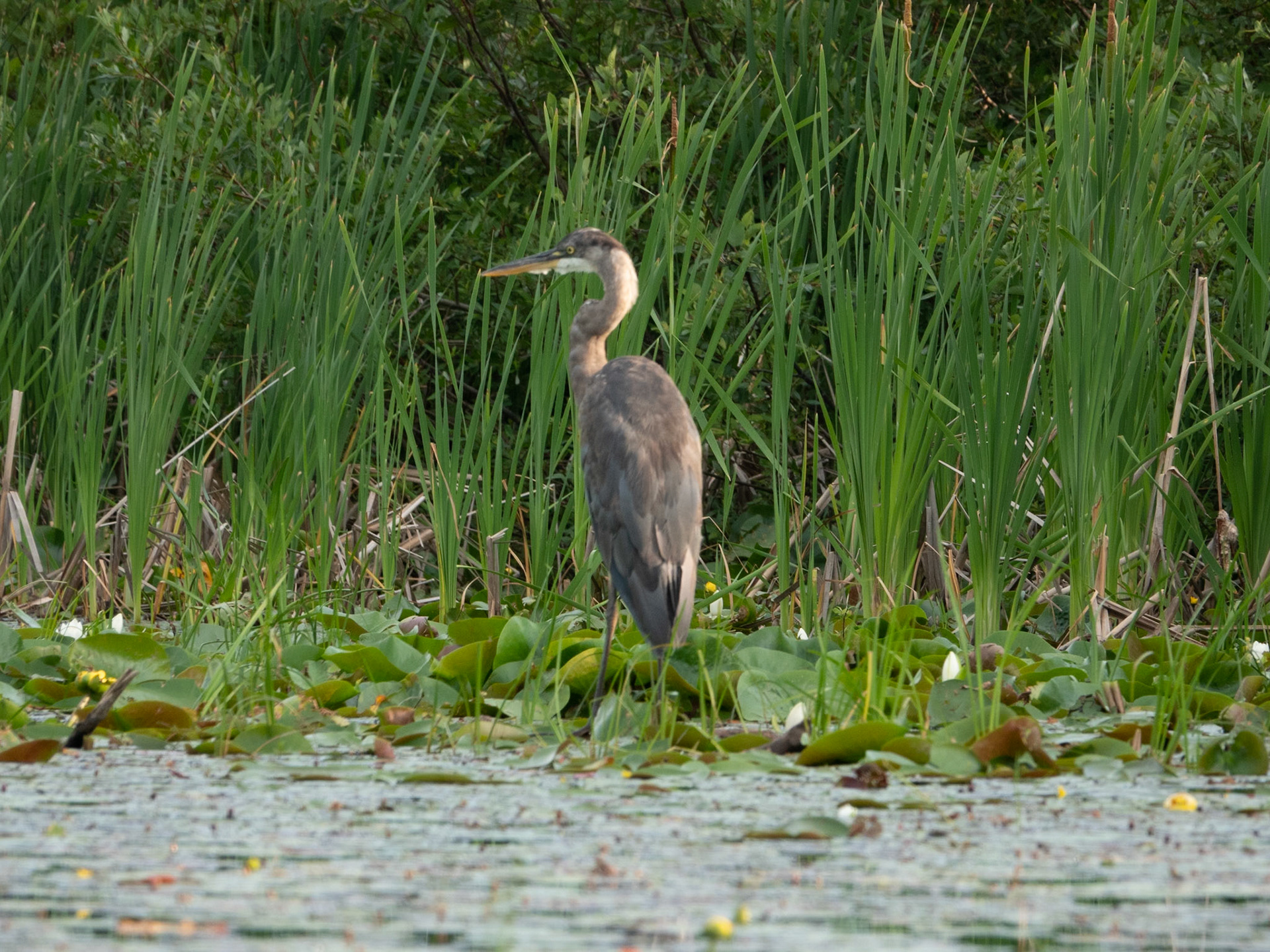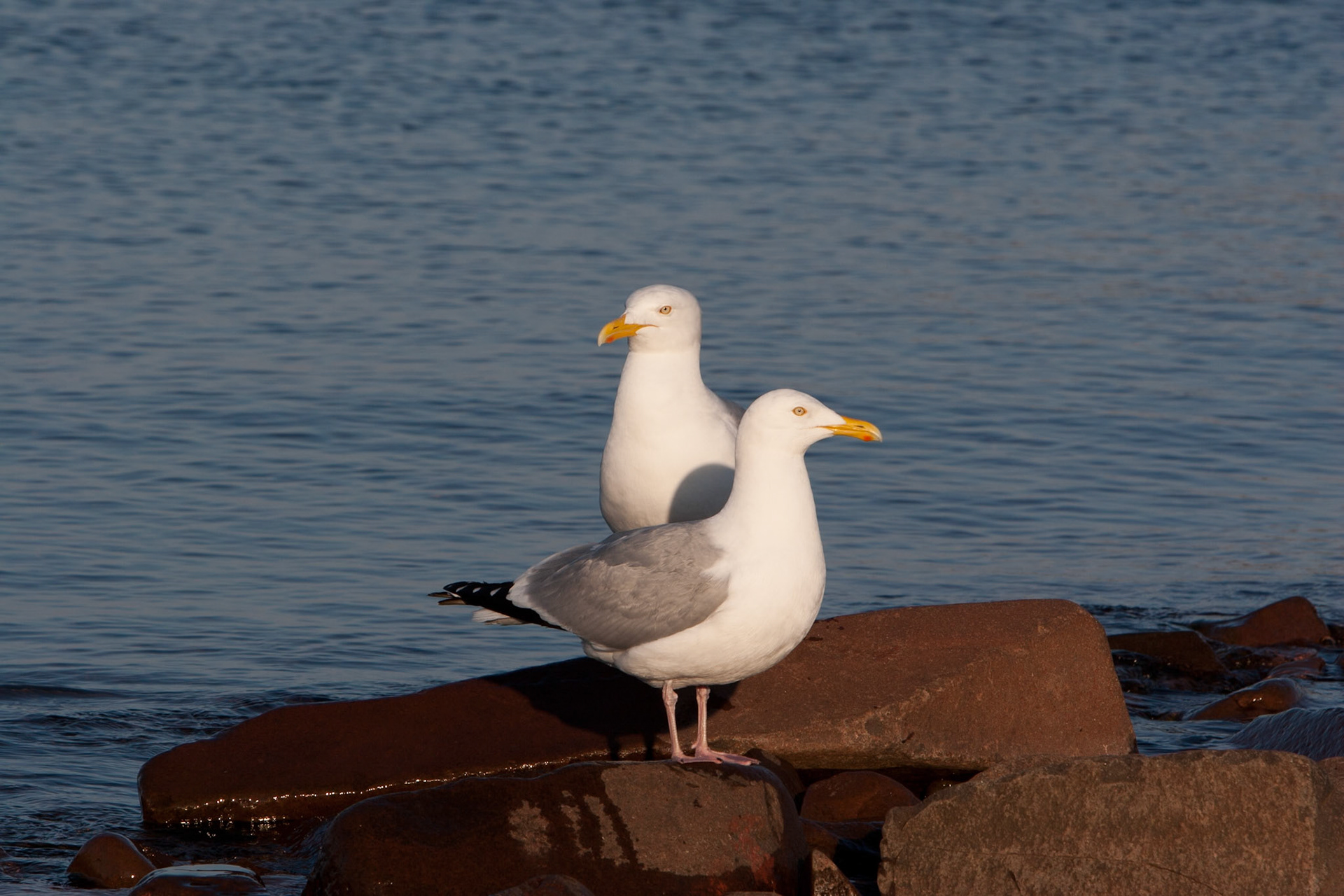 A Great Blue Heron watches for an early morning snack in the waters of Lake Superior near Superior Entry.