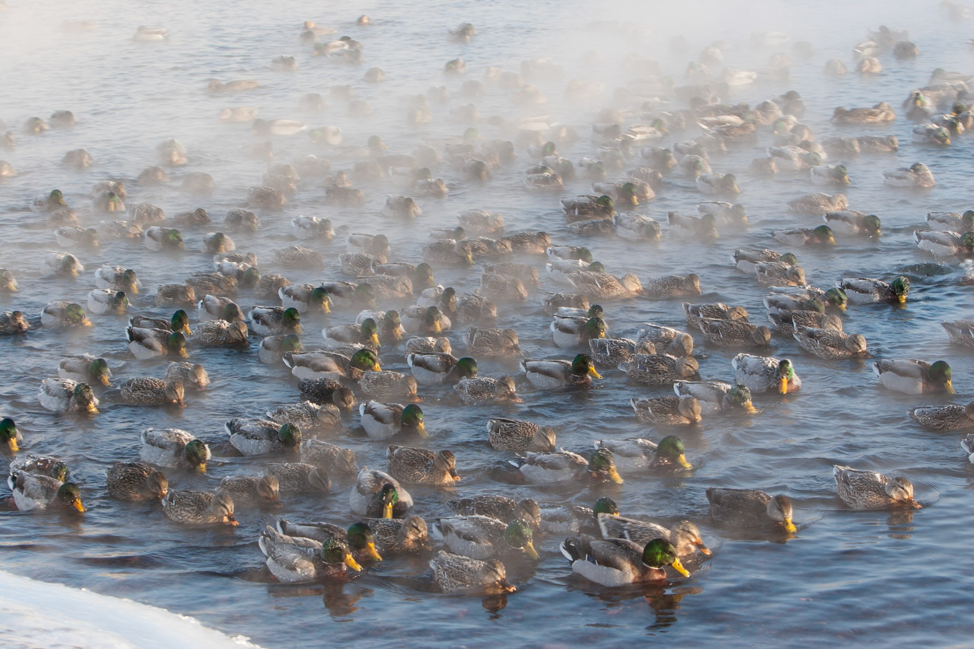 A mallard duck stands in the frigid cold on the only open water in December.